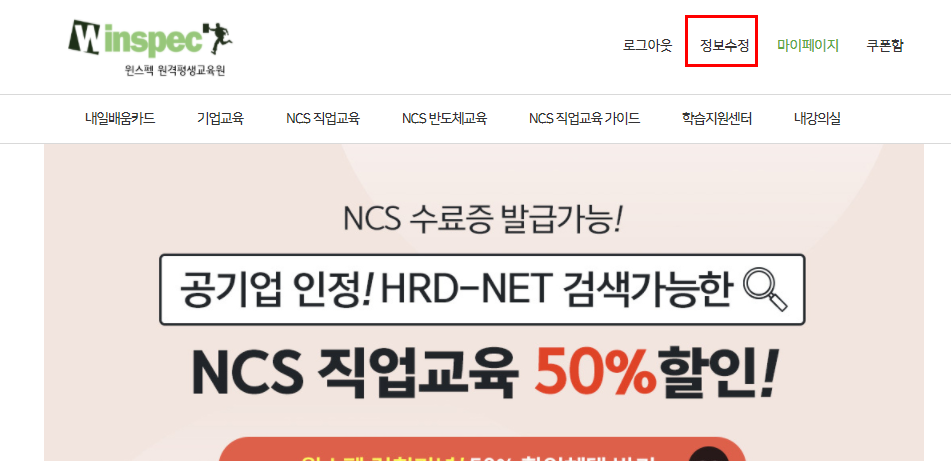 1. 로그인 후, 홈페이지 상단 [정보수정] 클릭