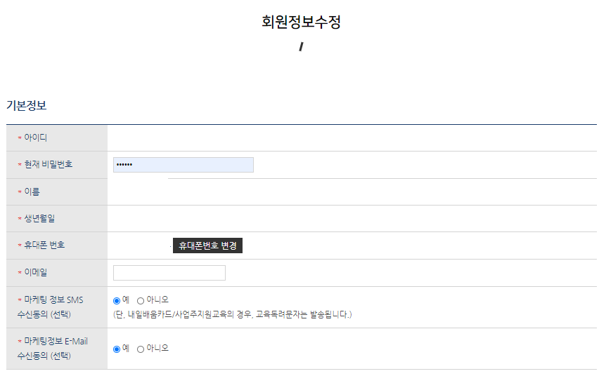 - 현재 비밀번호 : 발급받으신 임시비밀번호 or 현재 사용중인 비밀번호